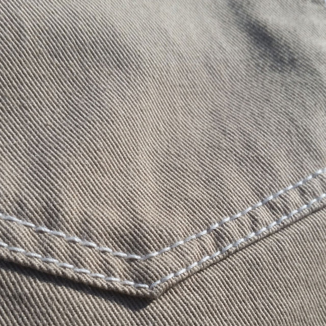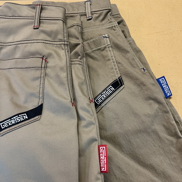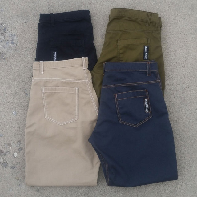 Super strong and comfortable. double seemed, zip fly, label on the back pocket. narrow fit. Not as baggy as our skate pants, but just as comfortable.