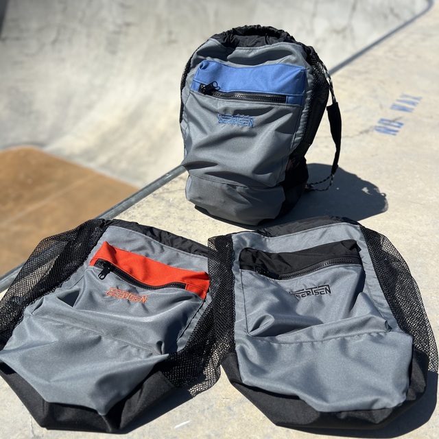 these bags areheavy duty, stealthy, and ready for action. with strong double cinch duffel polypropylene rope and reinforced locking carabiners. it's a perfect size for taking what you need to the skatepark. The heavy duty version is made with 500d-1000d Cordura. Reinforced with nylon thread. The double cinch clips to the bottom and allows for easier backpack style wearing, with body rope protector for more comfort.Made with big eyed cargo mesh for top to bottom air flow. Featuring a pleated front pocket, ideal for storing your phone, wallet, keys and much more. Reinforced with strong webbing along the seams. 24 inch opening for easy access and 24 inch deep for lots of storage